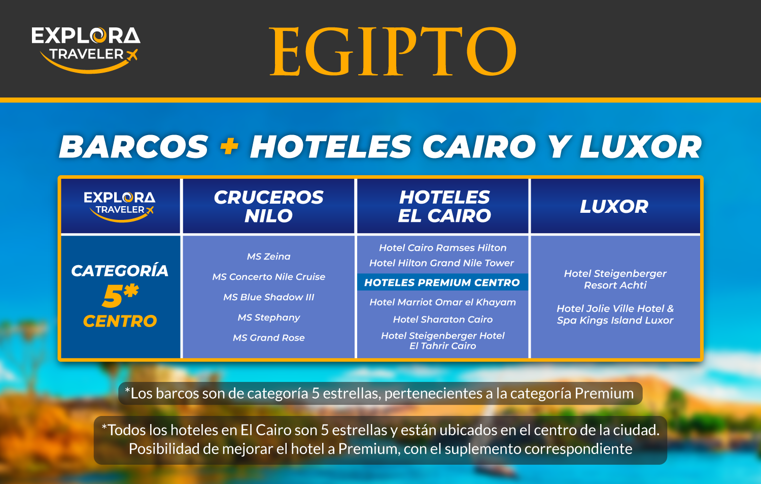 Disfruta de todo el esplendor de la tierra de los faraones con este programa tan especial, repleto de contenido y en pensión completa. Descubre Egipto en este fascinante viaje comenzando con un vuelo directo desde tu ciudad a la impresionante ciudad de El Cairo, donde disfrutarás de 3 noches explorando las impresionantes pirámides de Giza, la majestuosa Esfinge y el vibrante bazar de Jan el-Jalili. Además de estar todas las excursiones incluidas en El Cairo, este programa también contempla el Nuevo Gran Museo, recientemente inaugurado y que tantas expectativas ha generado pues se ha convertido en el museo más grande del mundo de antiguas civilizaciones. Desde allí, cogeremos un vuelo interno a Abu Simbel para conocer los imponentes templos tallados en roca en frente del lago Nasser. Después nos embarcaremos en un crucero de 3 noches recorriendo el majestuoso Nilo, disfrutando de sus imponentes atardeceres y visitando templos icónicos como Philae, Kom Ombo y Edfu. Finaliza la aventura con una noche en Luxor, explorando el Valle de los Reyes y los legendarios templos de Karnak, Luxor y Hatshepsut.