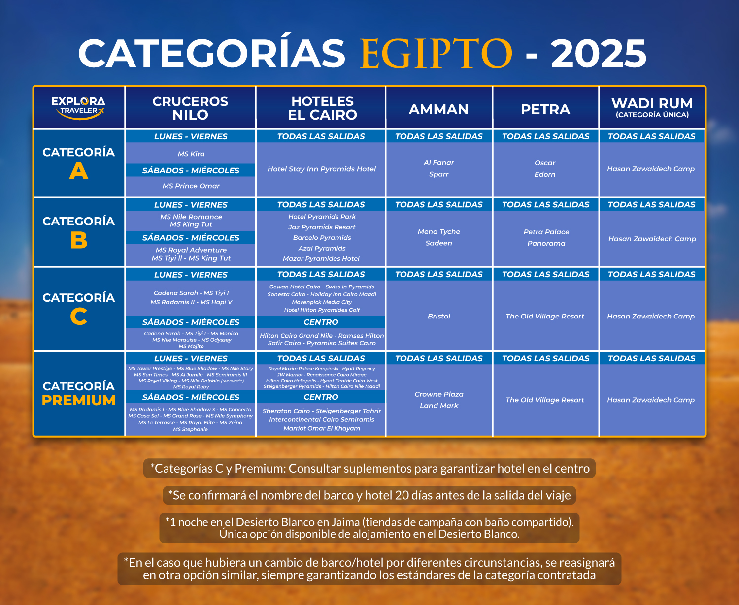 - En caso de tener la noche del 31 de diciembre en Petra, Wadi Rum o El Cairo, la cena de gala de fin de año no está incluida. Consultar suplemento