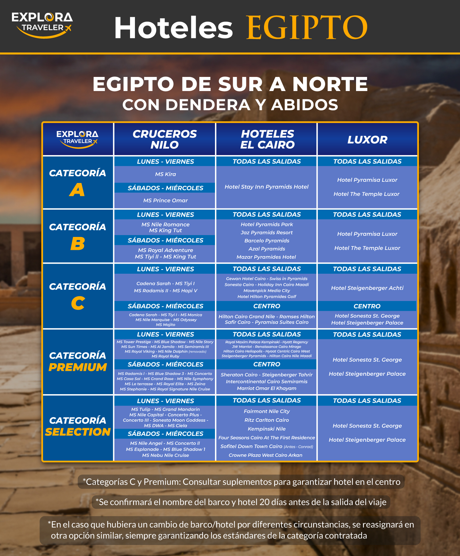 • Luxor: Templo de Medinet Habu,Valle de las Reinas, Templo en Abidos. Valle de los Reyes (incluida la entrada a 3 tumbas), Templo de Hatshepsut, Templos de Luxor y Karnak y Colosos de Memnon