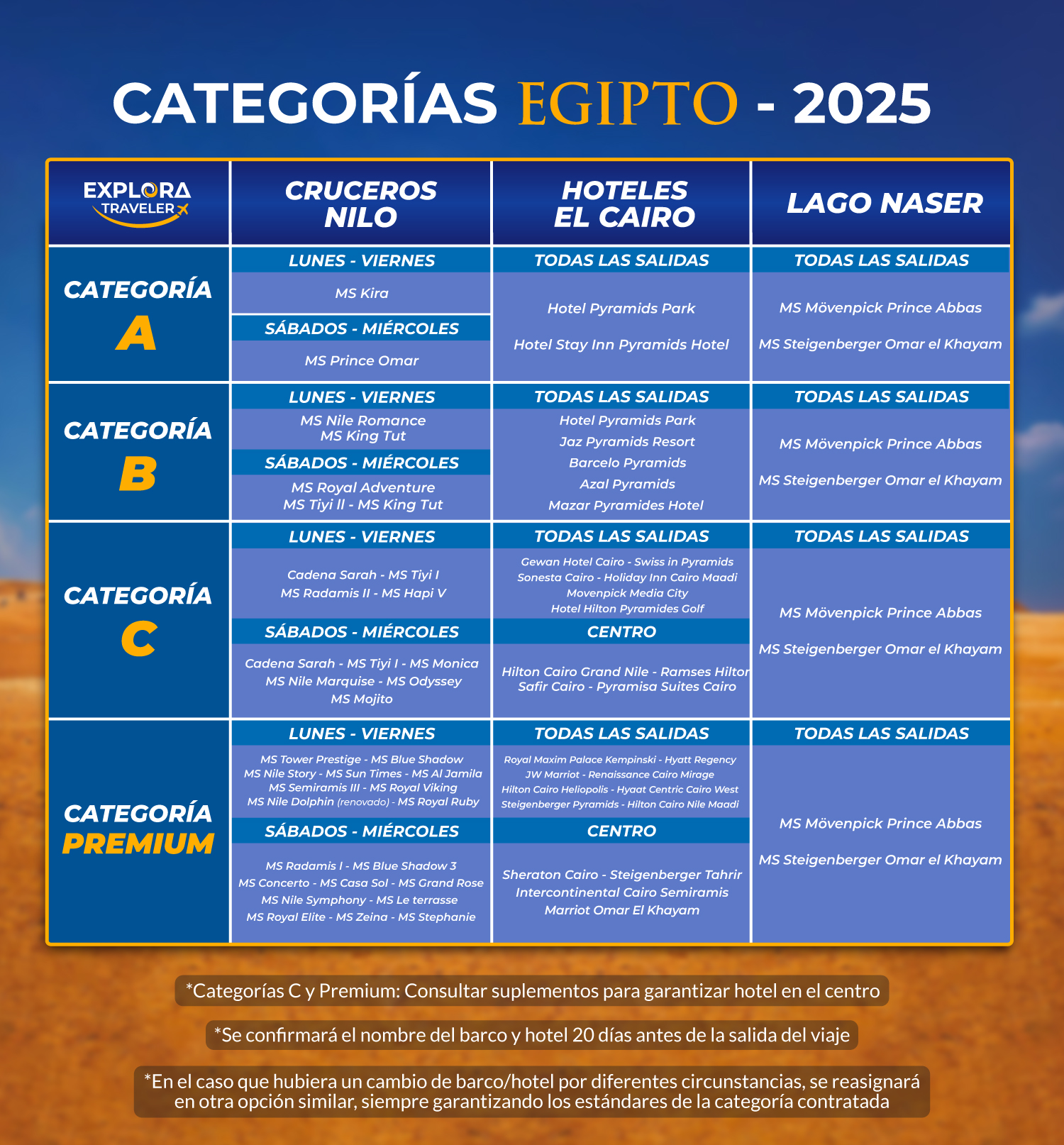 - En caso de tener la noche del 31 de diciembre en El Cairo, la cena de gala no está incluida. Consultar suplemento.