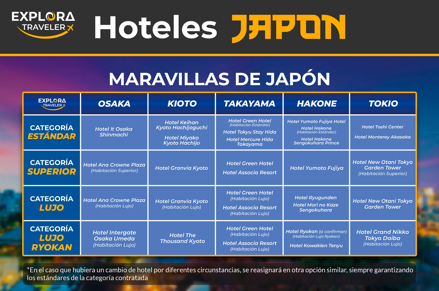 - La categoría Lujo Ryokan incluye alojamiento tipo Ryokan en Hakone (habitación tradicional japonesa con futón en lugar de cama). Esta categoría no admite ni niños ni habitaciones triples.